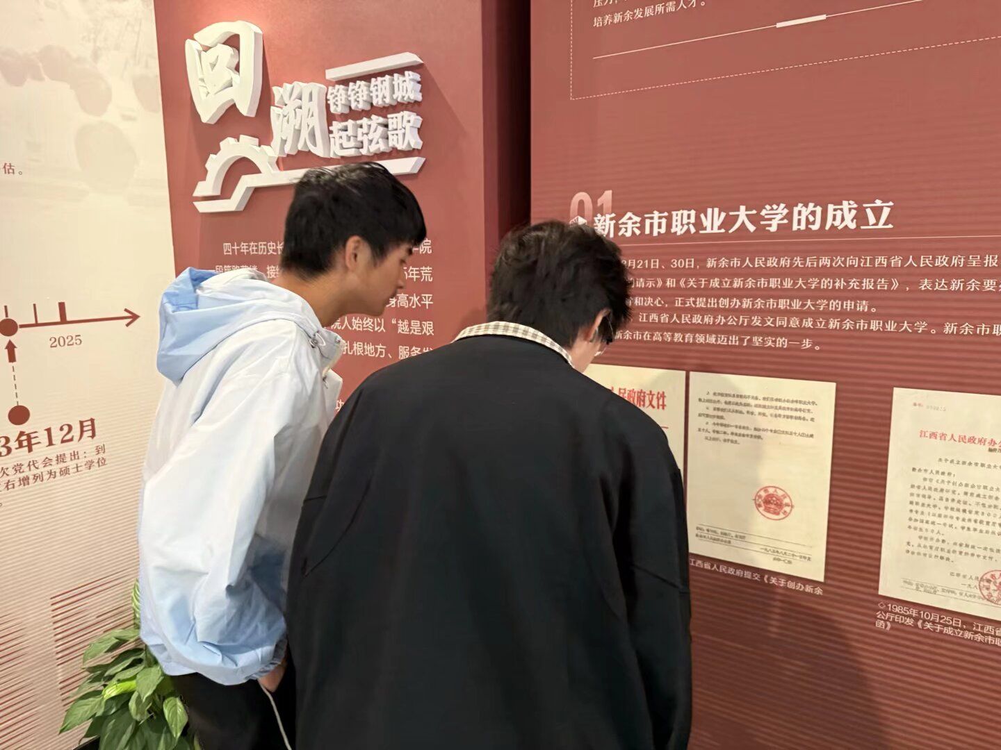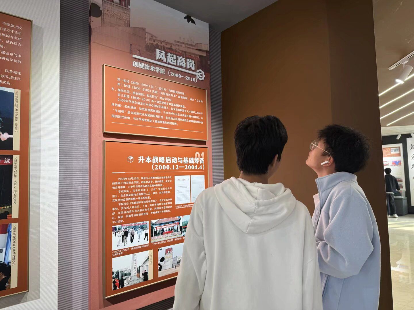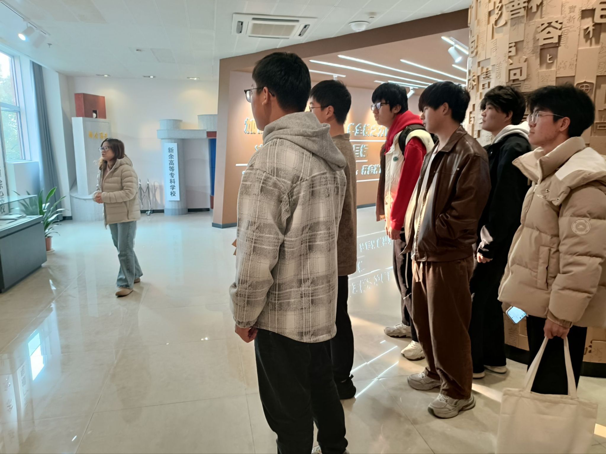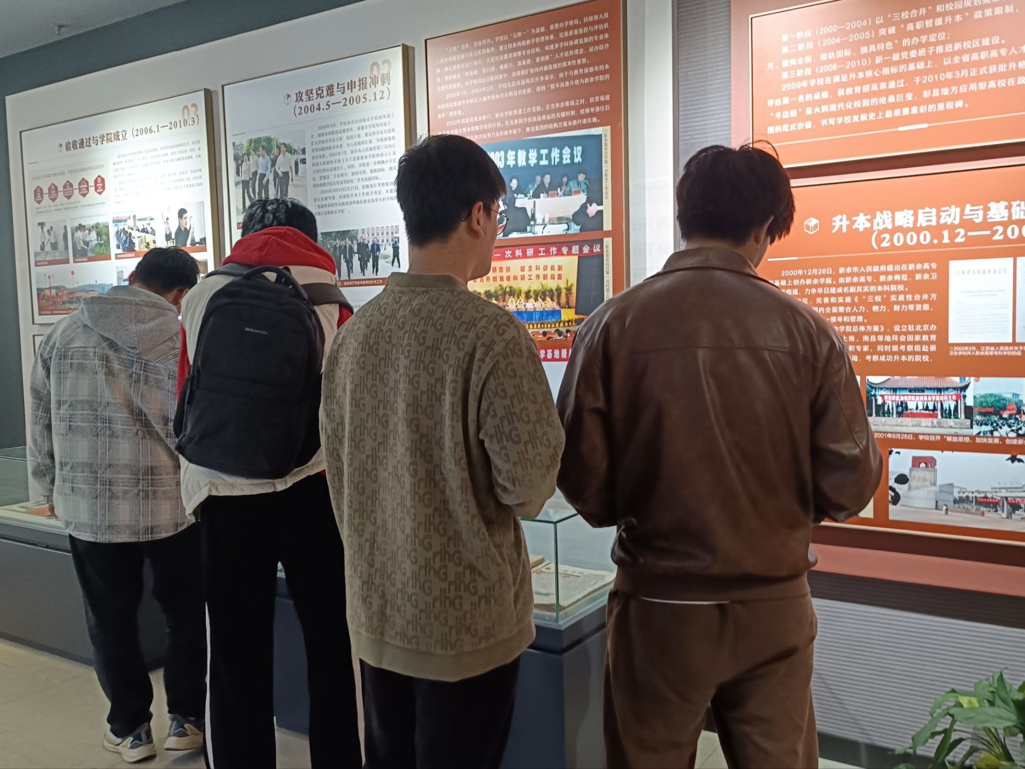 在一张张泛黄的照片、一件件珍贵的实物、一段段详实的文字中,同学们沉浸式感受了学校的百年风雨与辉煌历程。从新余职业大学的初创起步,到多所院校并入后的资源整合,再到升格为356体育在线官网后的跨越发展,同学们直观感受到学校四十年来在办学规模、团队建设、人才培养等方面的艰辛探索与成就,了解到学校作为江西省首批转型发展试点高校、始终紧扣区域产业需求,逐步形成以新能源等应用型学科为核心的办学特色,进一步增强了对学校“求新、求实、求善”校训的认同感与归属感。