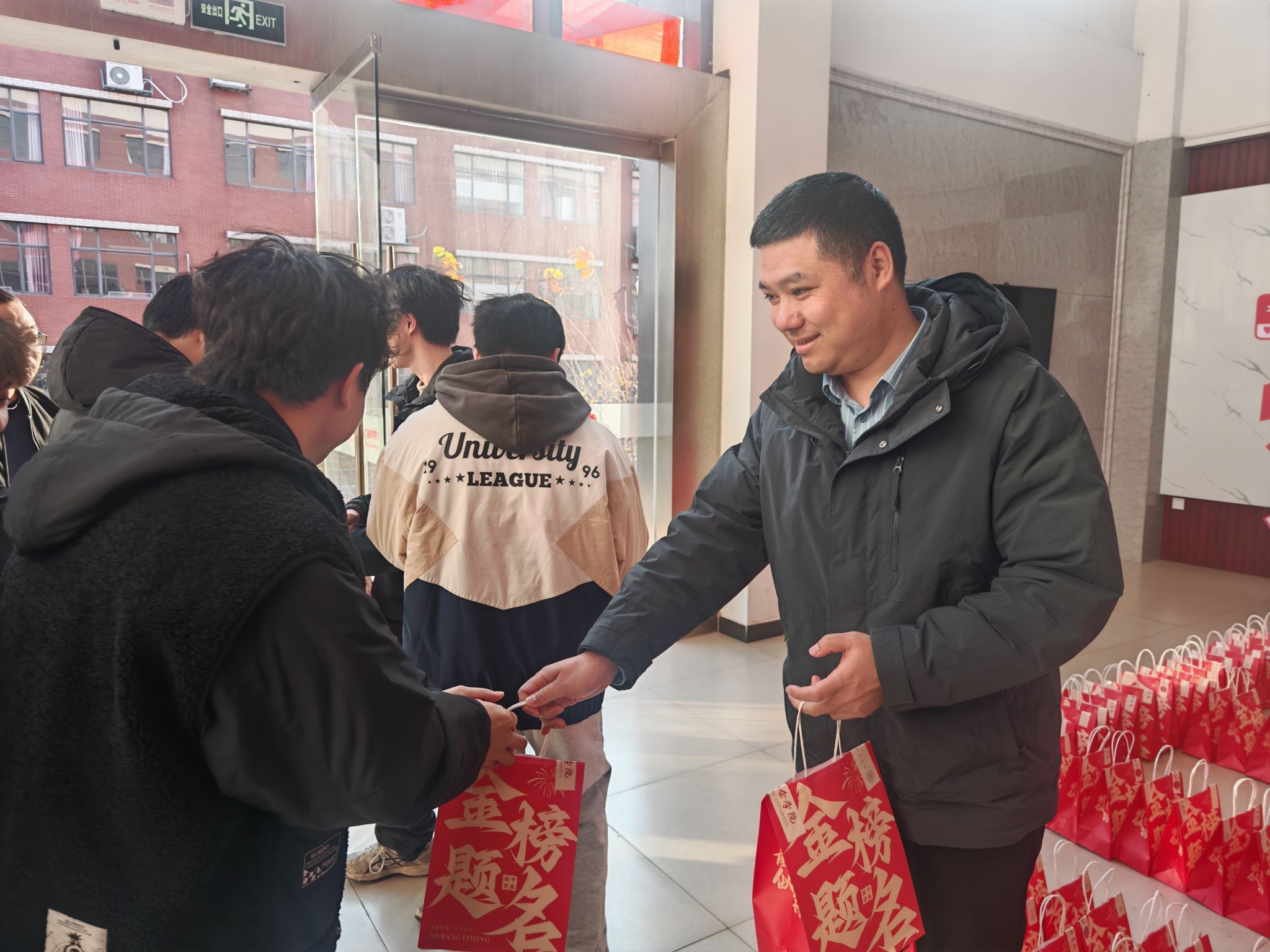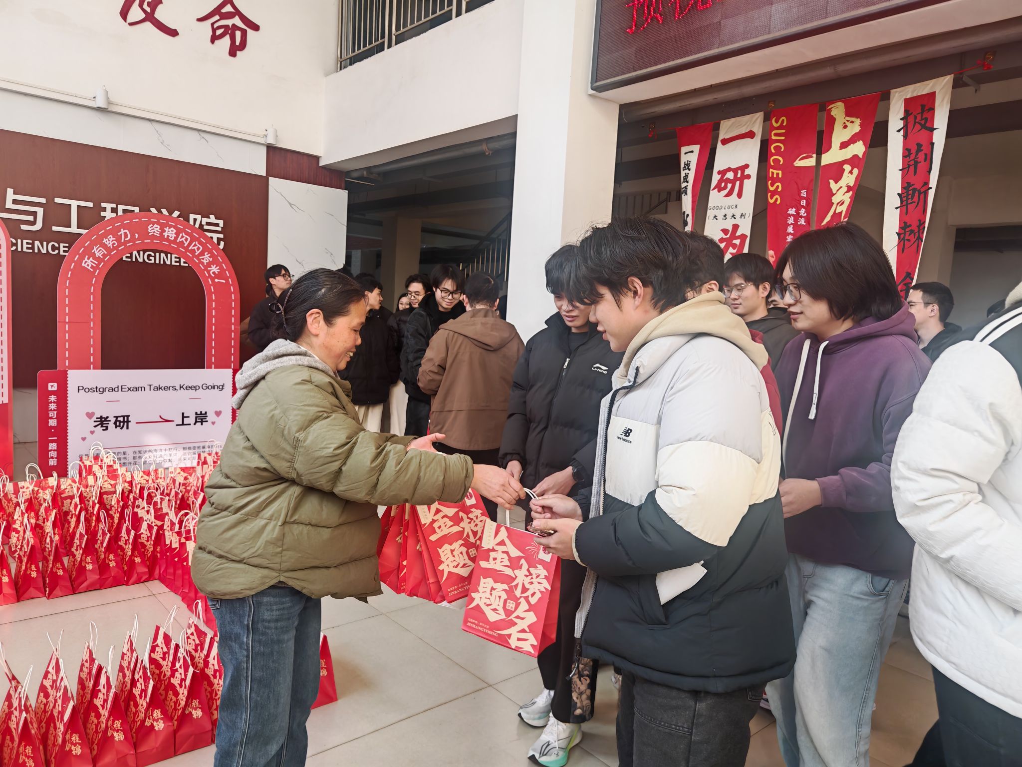 随后,院领导与班主任一同前往学院一楼大厅,为每一位考研学子发放学院精心准备的“考研福袋”。福袋中装有备考文具、暖心小食、鼓励卡片等,每一份都承载着学院的祝福与期盼。