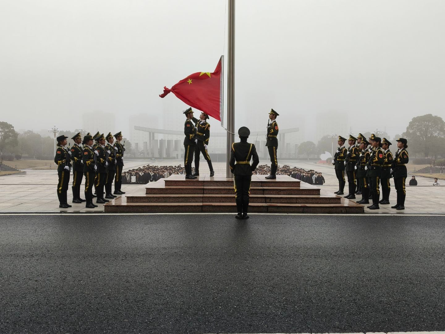 7时10分,国旗护卫队迈着铿锵有力的步伐,护送五星红旗走向升旗台。伴随着雄壮的《义勇军进行曲》,升旗手振臂一挥,鲜艳的国旗在晨光中冉冉升起。