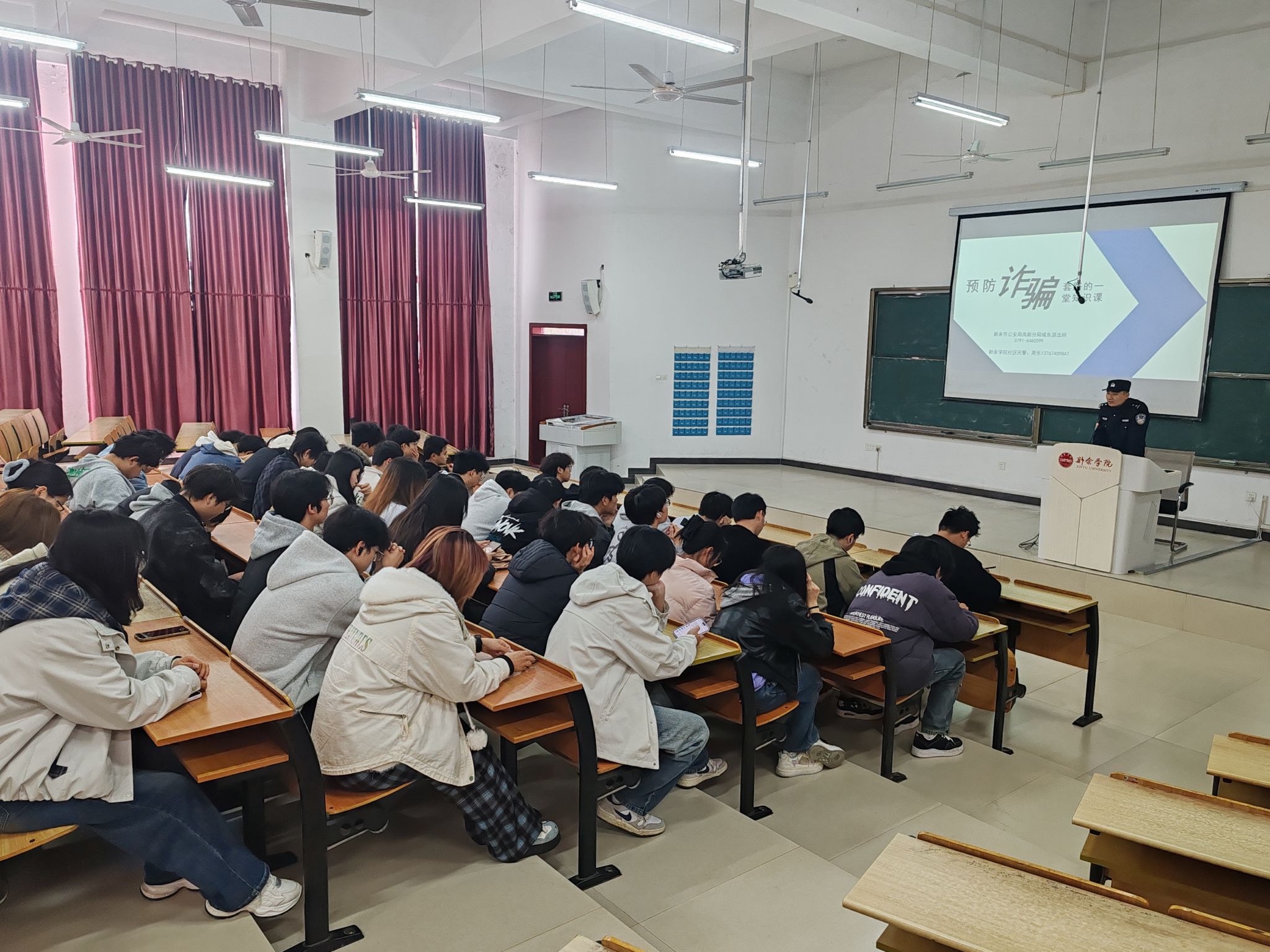 讲座中,周乐警官结合自身丰富的基层工作经验,针对当前校园安全面临的形势和特点,运用通俗易懂的语言和真实鲜活的案例,重点围绕防范电信网络诈骗、交通出行安全以及日常自我防护等方面进行了详细讲解。他特别剖析了针对员工群体的常见诈骗手段,如网络刷单、冒充熟人、游戏交易等骗局的作案手法和防范要点,提醒同学们要时刻保持警惕,不轻信、不透露、不转账,遇到可疑情况要及时向老师或警方求助。