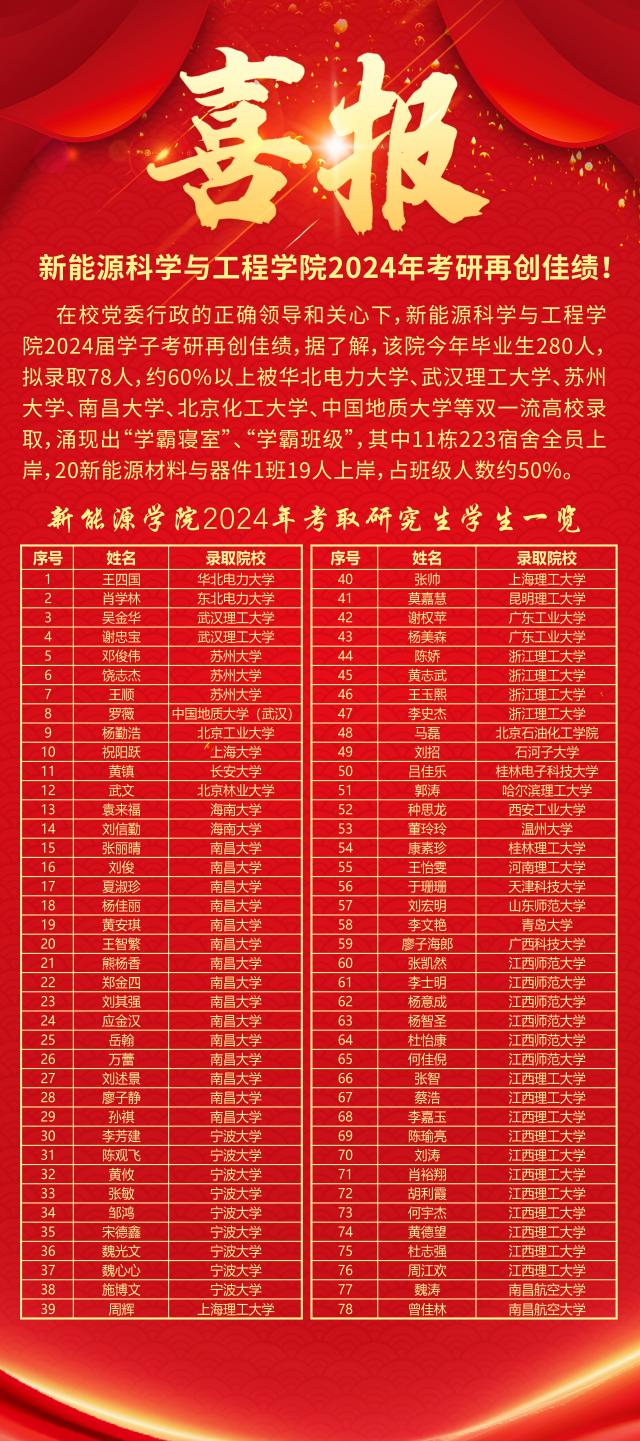 在公司党委行政的正确领导和关心下,356体育在线官网2024届学子考研再创佳绩,公司今年毕业生280人,拟录取78人,约60%以上被华北电力大学、武汉理工大学、苏州大学、南昌大学、北京化工大学、中国地质大学等双一流高校录取,涌现出“学霸寝室”、“学霸班级”,其中11栋223宿舍全员上岸,20新能源材料与器件1班19人上岸,占班级人数约50%。