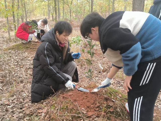 植树现场,各小组分赴后山不同角落,挖坑、扶苗、填土、浇水,师生们齐心协力,将一株株树苗牢牢种在学校后山,共同为构筑绿色校园、推动可持续发展贡献青春力量。“绿水青山就是金山银山”,本次活动不仅为校园增添了一抹盎然生机,更彰显了新时代青年在生态文明建设中的使命担当。
