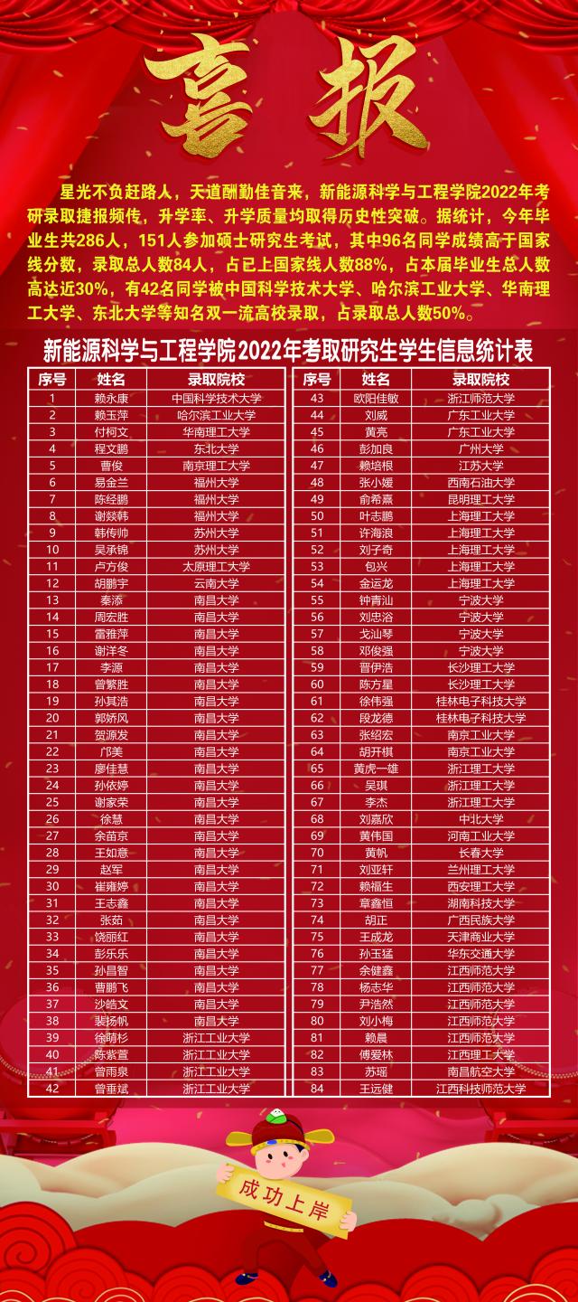 星光不负赶路人,天道酬勤佳音来,356体育在线官网2022年考研录取捷报频传,升学率、升学质量均取得历史性突破。据统计,今年学院毕业生共286人,151人参加硕士研究生考试,其中96名同学成绩高于国家线分数,录取总人数84人,占已上国家线人数88%,占本届毕业生总人数高达近30%,有42名同学被中国科学技术大学、哈尔滨工业大学、华南理工大学、东北大学等知名双一流高校录取,占录取总人数50%。