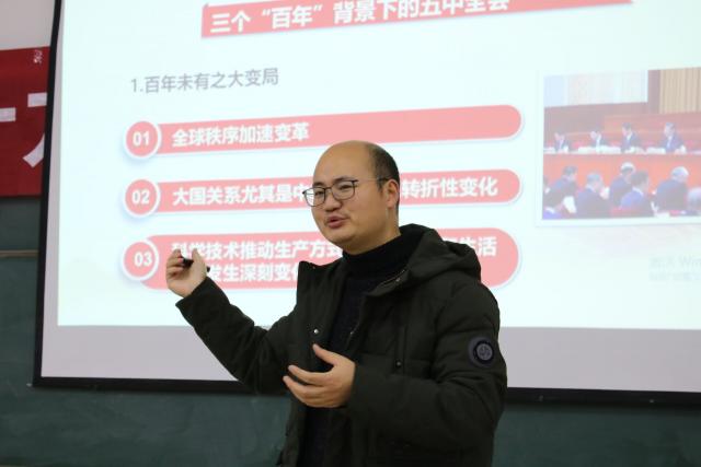 12月10日,马克思主义学院李洪运博士为356体育在线官网学子作了一堂精彩的十九届五中全会精神宣讲。宣讲会由该公司党委副书记主持,100余名大一新生参加了会议。
