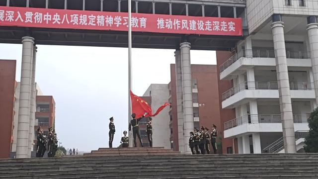 7点15分,升旗仪式正式开始,校国旗护卫队迈着整齐划一的步伐护送鲜艳的五星红旗来到国旗台下,伴随着庄严肃穆的《义勇军进行曲》响起,五星红旗冉冉升起。全体师生肃立,向国旗致以崇高的敬意。