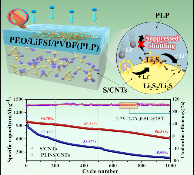 针对这一问题,公司教师李玲在攻读博士期间研究并制备一种复合涂层用于硫碳电极,与传统的硫电极相比,这种改性电极上的复合涂层可以抑制PEO基中可溶性PEO-Li2Sx(x>4)的产生,减少活性物质的损失,同时涂层中的组份可以促使多硫化物不生成可溶性的多硫化物而直接转化为Li2S2/Li2S,抑制穿梭效应,提升锂硫电池循环稳定性的效果。所使用的退火工艺可以处理凝胶涂层引发的不同相结构之间的 Li+浓差扩散,抑制凝胶涂层中聚合物结晶,从而提复合电极的电子和离子导电率,使锂硫电池表现出优异的倍率性能和循环性能。这项研究成果发表在国际著名期刊《先进工程材料》上。