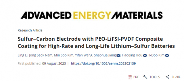 近日,公司356体育在线官网教师李玲以第一作者在国际顶级期刊上《Advanced Energy Materials》(AEM)上发表《用于高倍率长寿命锂硫电池的PEO-LiFSI-PVDF复合涂层包裹硫碳电极》论文,该期刊的JCR和中科院分区均为Q1,最新期刊影响因子为27.8,属于新能源和化学领域的国际顶级期刊。