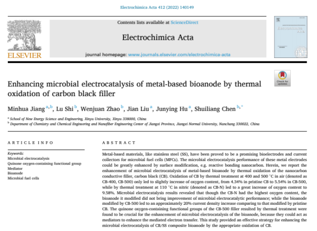 近日,公司教师江民华博士以第一作者在电化学领域国际权威刊物《Electrochimica Acta》(影响因子IF=6.9)上以“Enhancing microbial electrocatalysis of metal-based bioanode by thermal oxidation of carbon black filler”为题发表最新研究成果(DOI: 10.1016/j.electacta.2022.140149)。