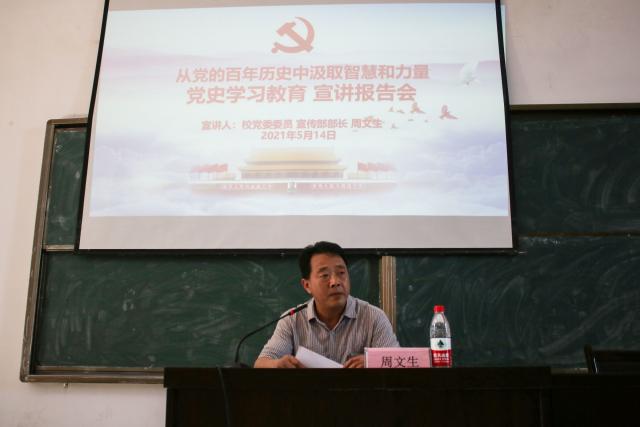 为深入学习贯彻习近平总书记在党史学习教育动员大会上的重要讲话精神,使广大师生把习近平总书记的重要讲话精神和关于党的历史的重要论述学懂弄通,把中国共产党为什么“能”、马克思主义为什么“行”、中国特色社会主义为什么“好”学深学透,并从党的百年光辉历程中汲取智慧和力量,为“十四五”开好局、起好步凝聚强大力量,5月14日下午公司党委委员、宣传部部长周文生应邀来到356体育在线官网开展题目为《从党的百年历史中汲取智慧和力量》的党史学习教育专题宣讲。356体育在线官网教师代表、员工党员和入党积极分子共计100余人参加了此次宣讲会。