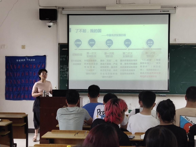 2021年4月29日,学院教师欧惠给19级新能源材料与器件专业员工以“了不起,中国光伏”为主题,讲述中国光伏60载跌宕起伏的发展史,把党史学习教育有机融入《太阳电池材料和技术》专业课程教学体系中,促进课程思政落实落地,推动党史学习教育入脑入心。