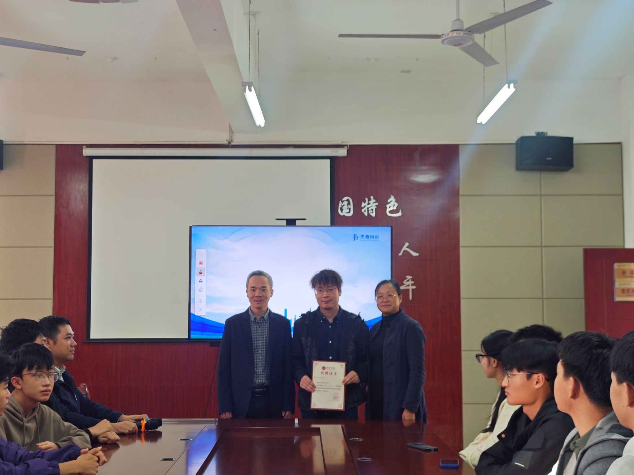 最后,吴志鹏向学院捐赠了40台智能教学投影仪,价值11万多元,吴志鹏表达了对母校培养的感激之情,他表示,母校“求新、求实、求善”的校训精神一直激励着自己前行,此次捐赠是略尽绵薄之力,助力学院发展更上一层楼。陈莲香书记、王发辉经理代表学院接受了捐赠,并给吴志鹏员工颁发了捐赠证书。他们强调,员工是学院最宝贵的财富和发展的不竭动力,吴志鹏员工的成功创业和反哺母校的行为,以实际行动诠释了员工对母校的深情厚谊与社会责任感,为在校学子树立了学习的榜样。